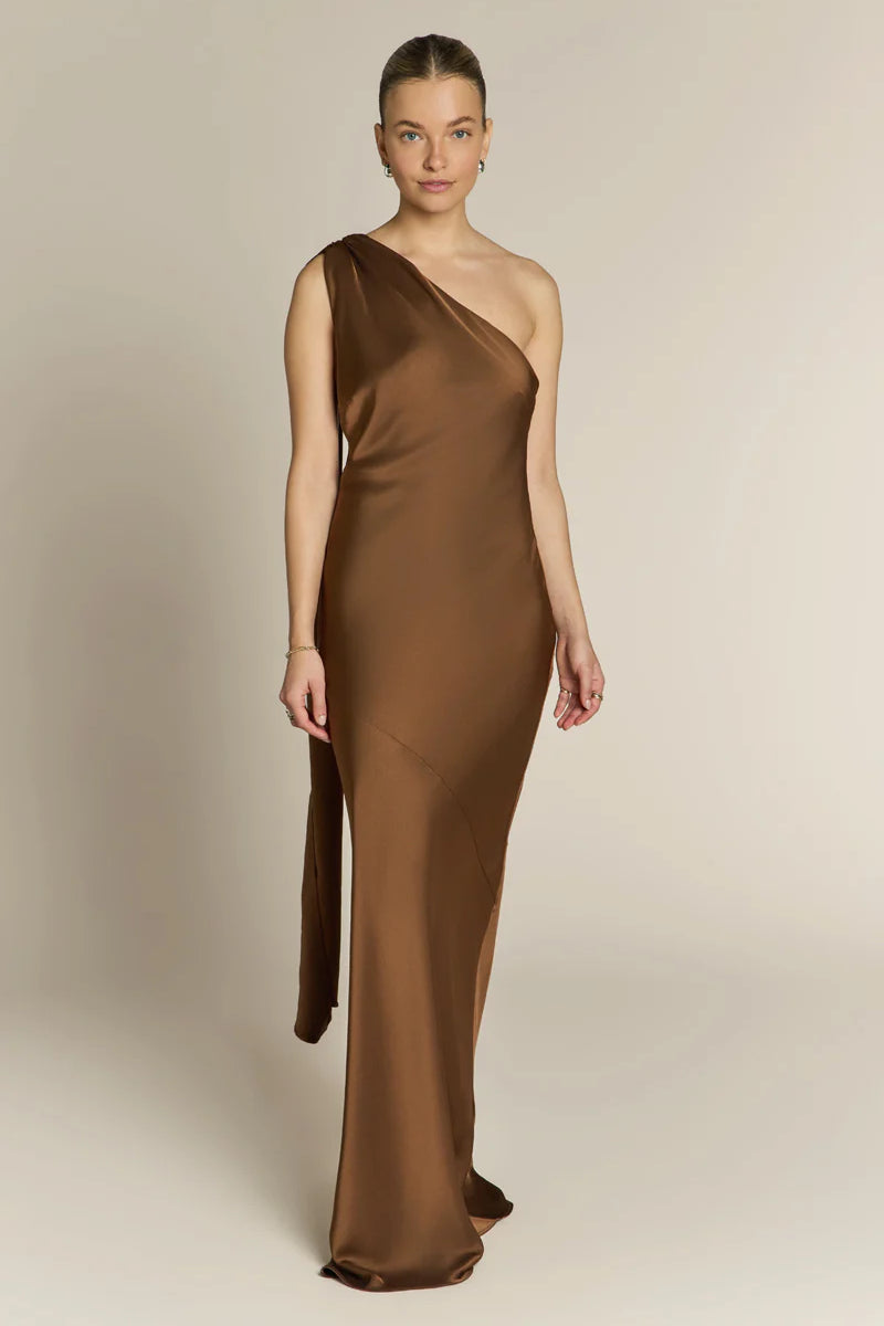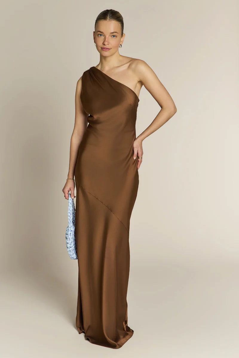 REWRITTEN Raye One Shoulder Dress in Chocolate Brown