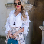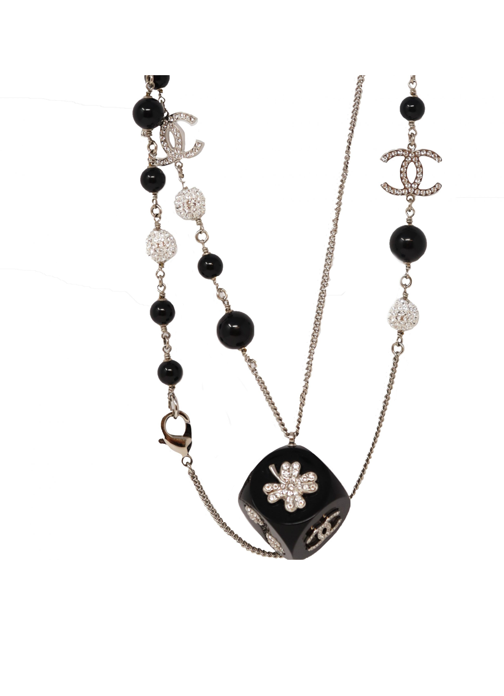 Eye catching and fun, this long Chanel necklace features a beautiful chunky die embedded with diamantés. Mathematically correct with opposite sides adding up to seven, there are interlocking “Cs”, a four leaf clover, the six letters of CHANEL and of course a 5. What better necklace for a white shirt and jeans combination!
