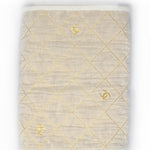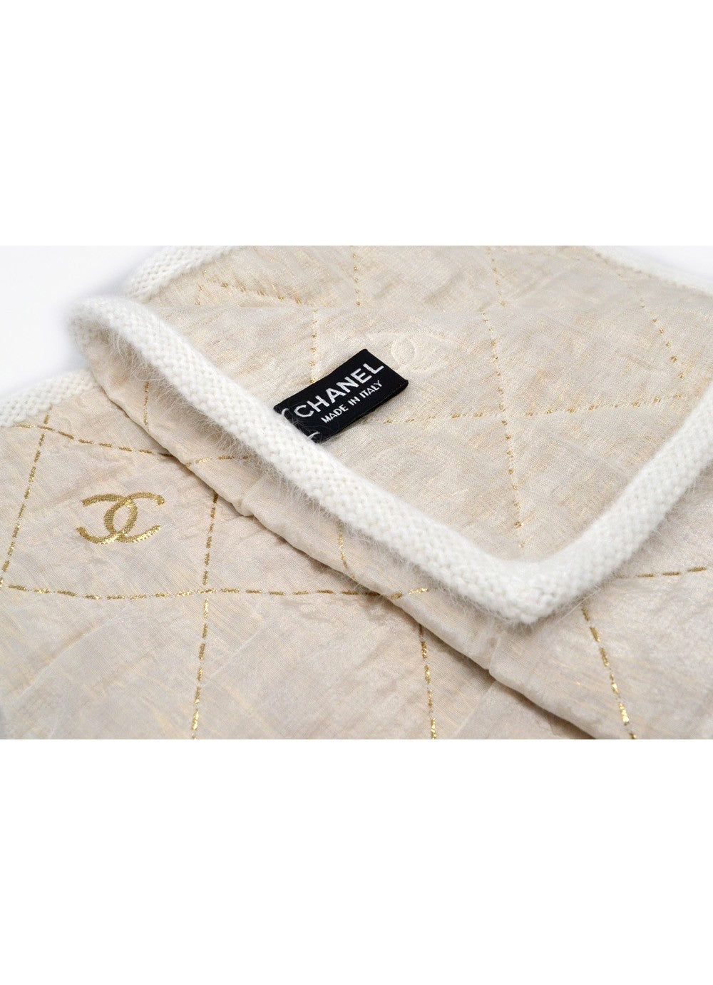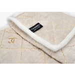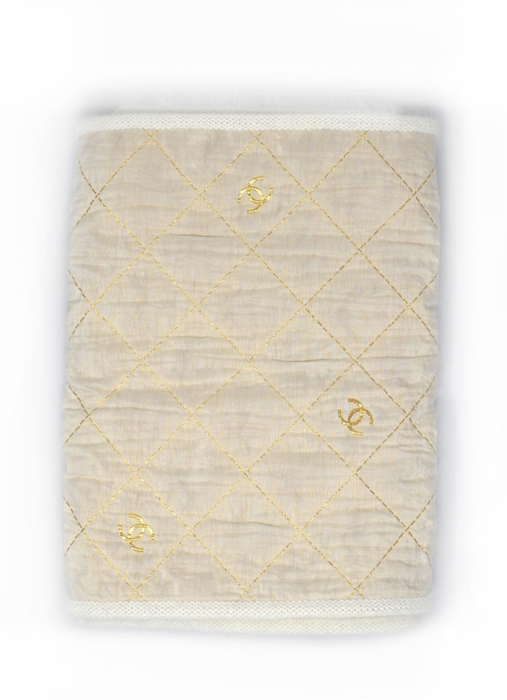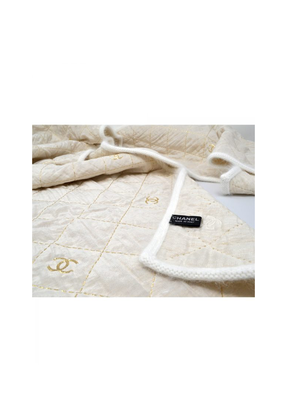 Keep warm in style with this Chanel Ivory Shawl. A combination of wool, silk, angora and cashmere, this ultra-luxe piece is quality at its finest. Patterned with gold metallic quilting detail and the signature Chanel logo, this is a lust have item to adore and adorn.