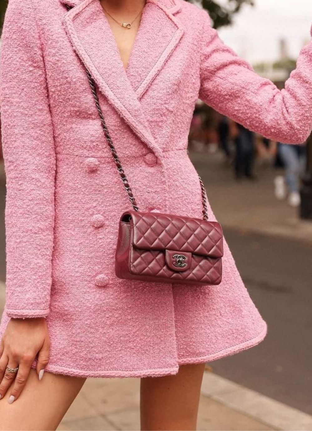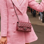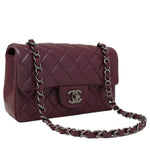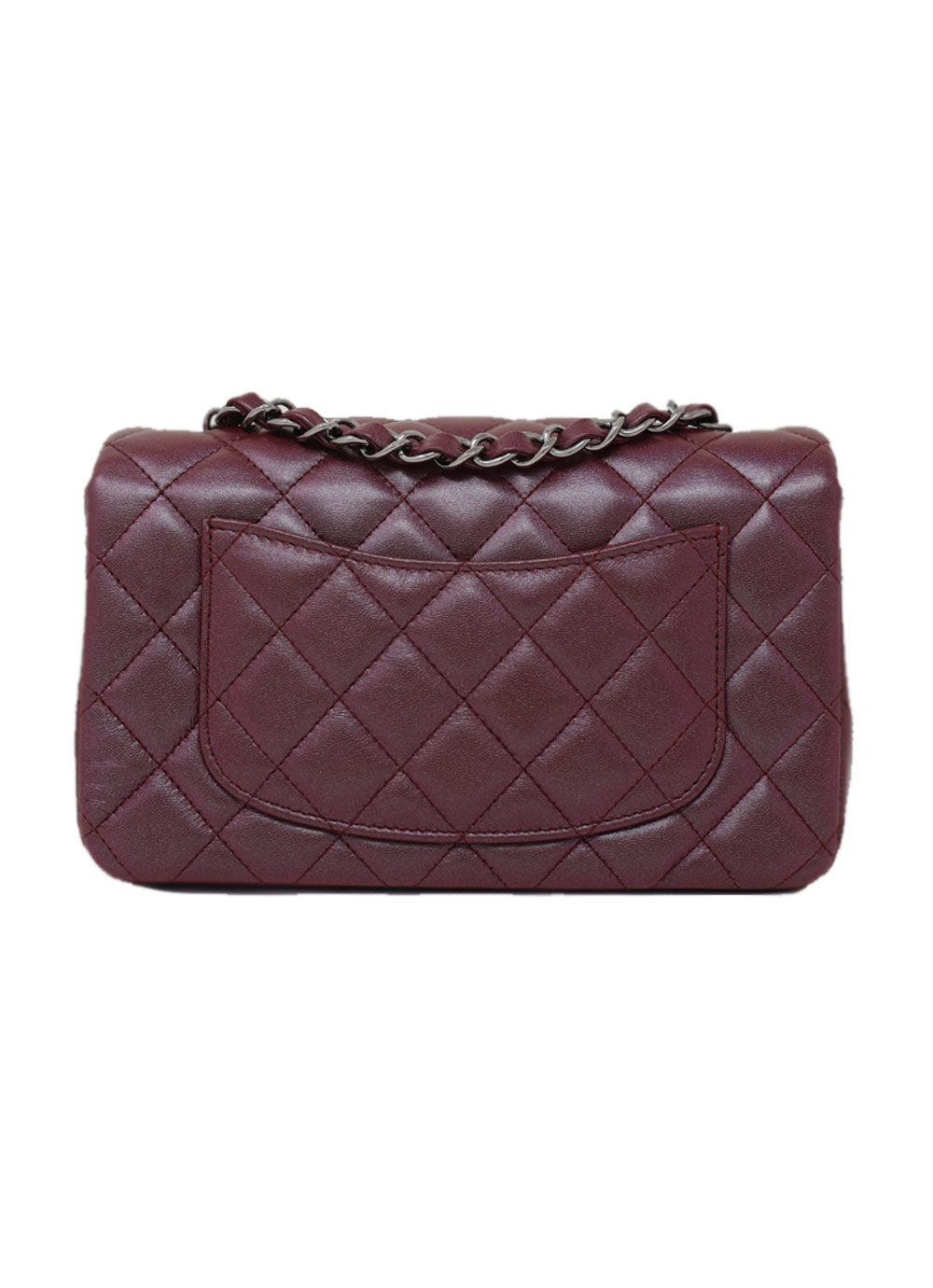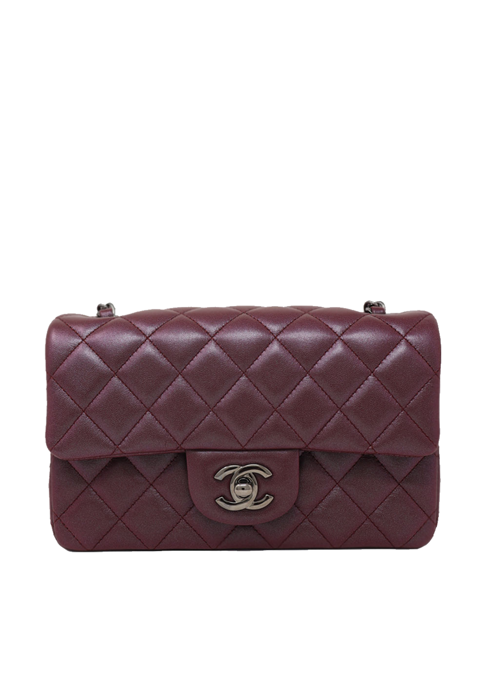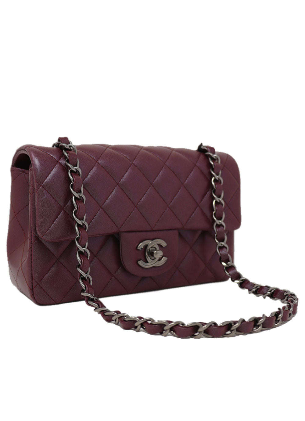Here is a beautiful Chanel mini flap in a modern, slightly iridescent, plum/burgundy colour. The metal detailing on the clasp and chain is in a shiny gun metal grey colour which gives the bag such a fresh and minimalist look. The Chanel mini flap is one of our favourite styles and we are delighted to include this very special colour to our collection.