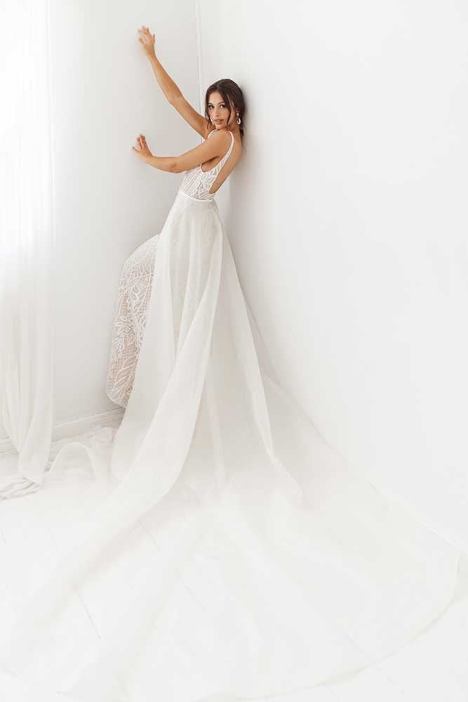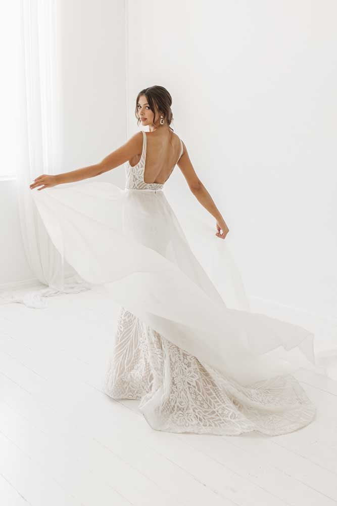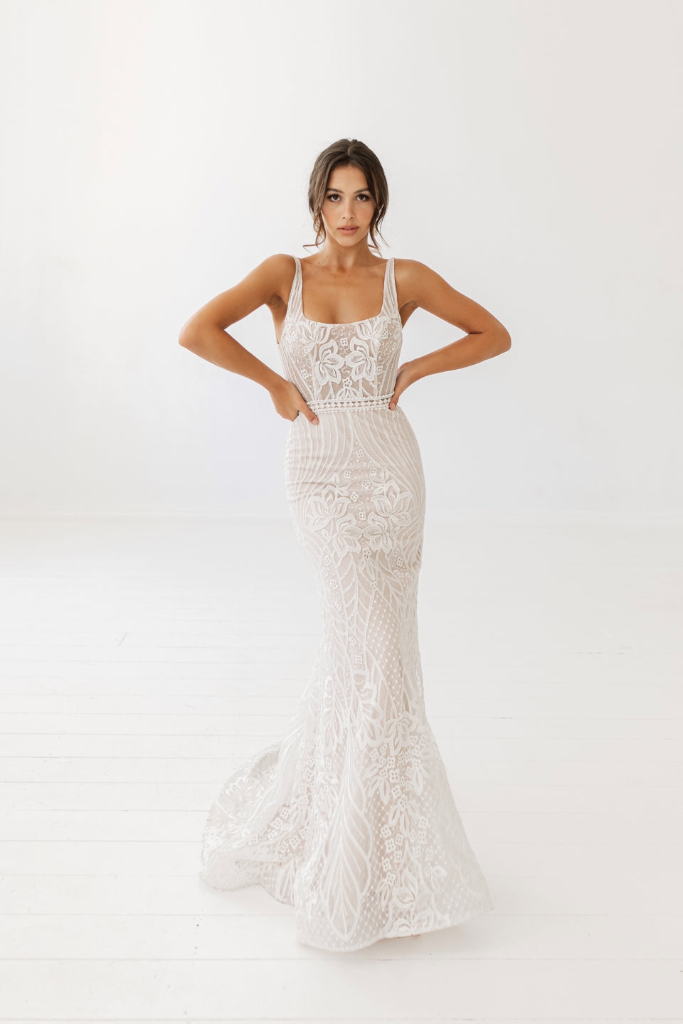 Made for the haute bohemian, the Promise gown is designed to accentuate the shape of the body through a series of carefully designed flourishing patterns.