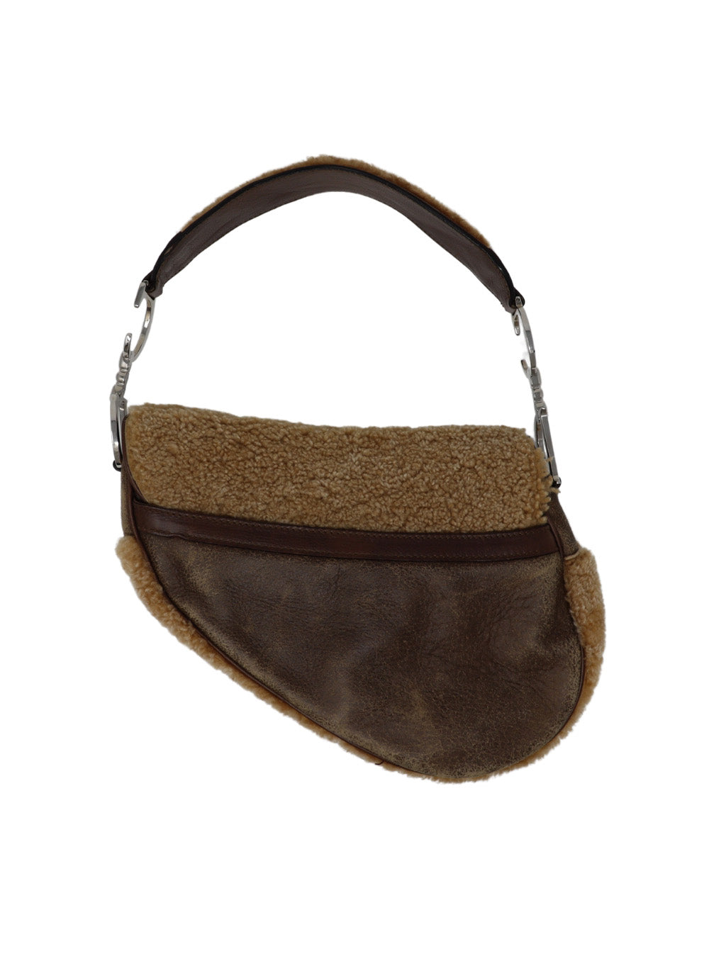 A rare Dior saddle bag from the 2005 John Galliano collection crafted in distressed brown leather with fluffy shearling detail and high-quality Dior signed silver-plated hardware. A gorgeous tactile piece of fashion history and perfect for wearing casually while still making a strong contemporary statement.
