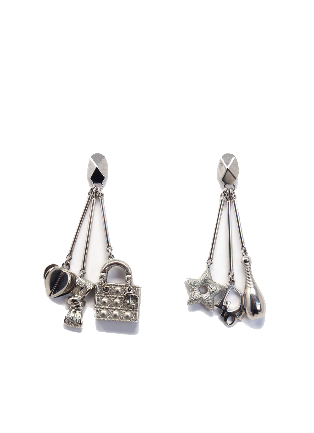 Dior lovers everywhere will adore these gorgeous designer vintage drop earrings in silver tone rhodium plate. Featuring 6 iconic Dior charms including our favourite Lady Dior bag. These are simply delightful in their detail and can be styled together or as two singles.