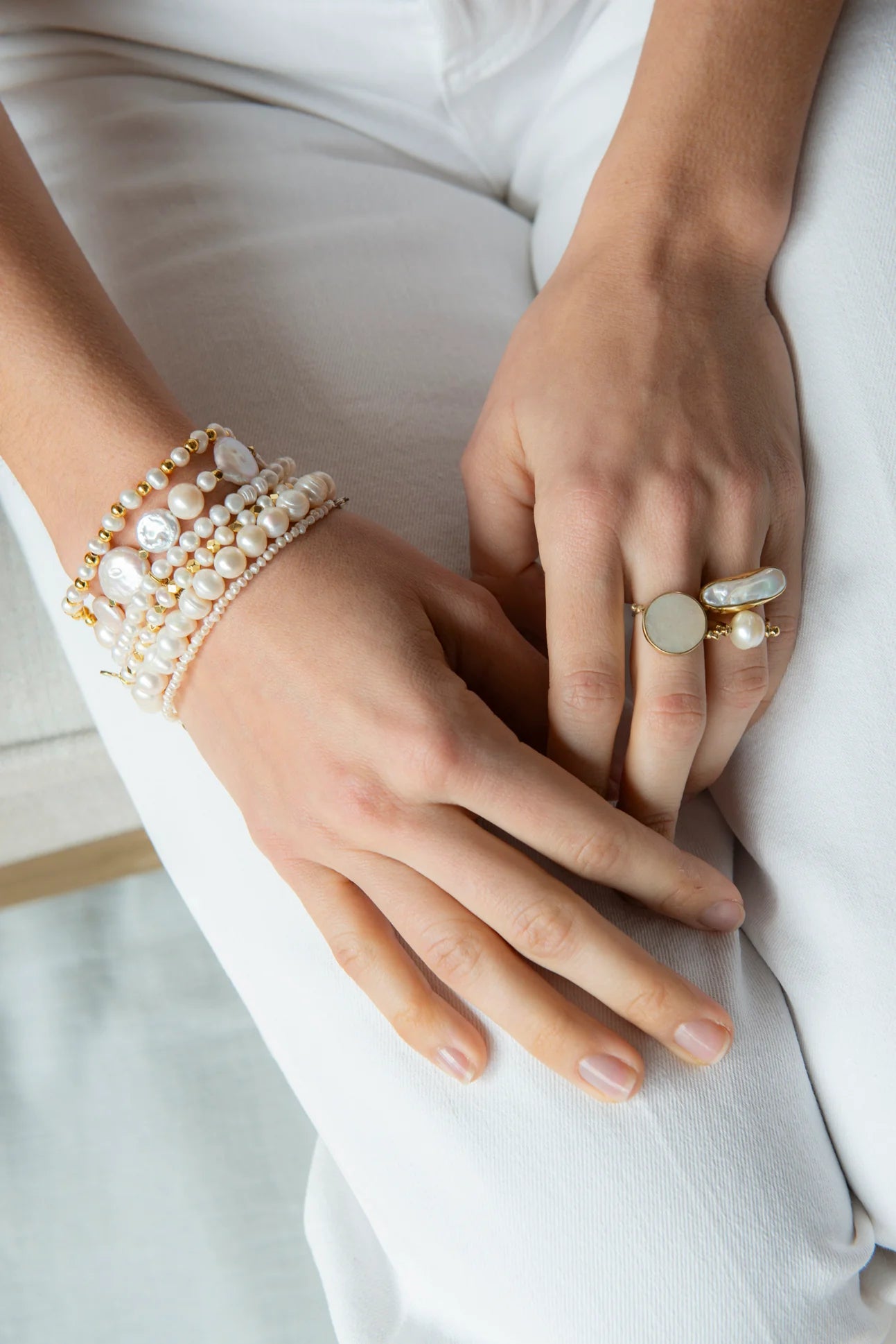 The Illuminate pearl ring has been handcrafted from solid brass and features a freshwater pearl. Part of our Sea Temple Collection, a perfect piece to stack with other rings or equally as stunning worn on it's own.