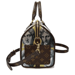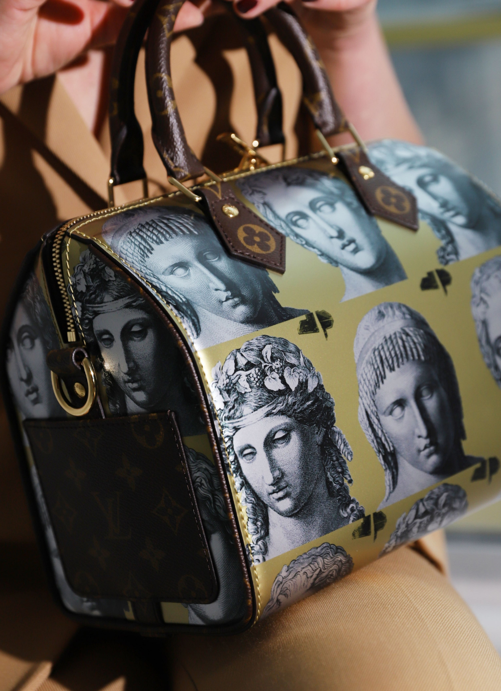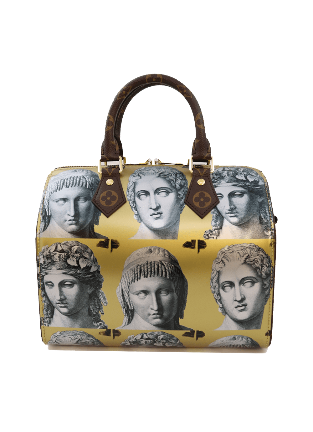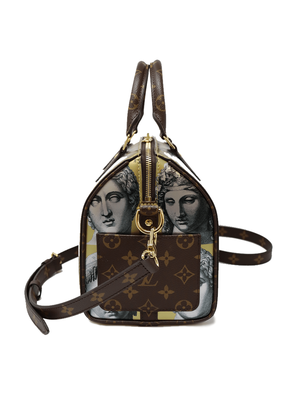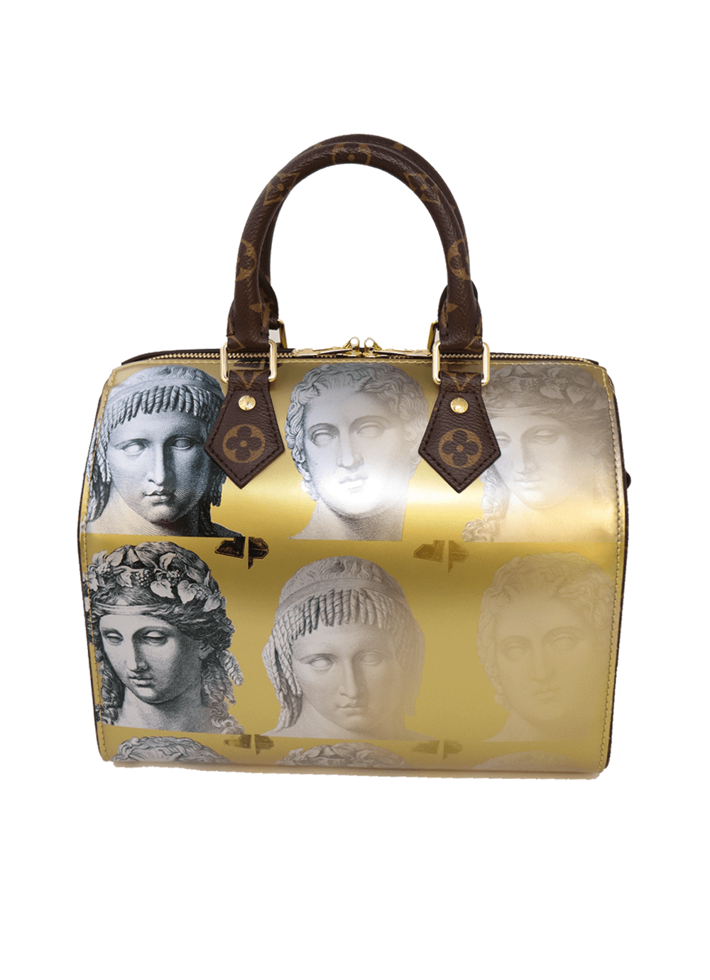Piero Fornasetti statue heads adorn this very special LV Speedy bag. The trims, handles and detachable shoulder strap are all crafted in the house Monogram design while the main body of the Speedy is in a very luxurious gold metallic leather.