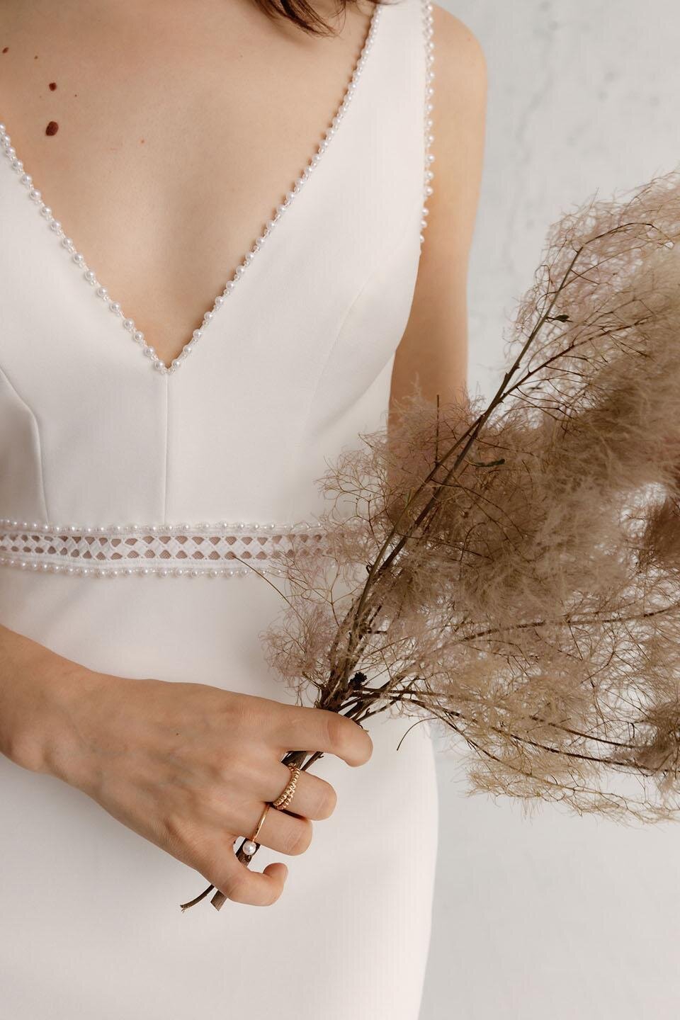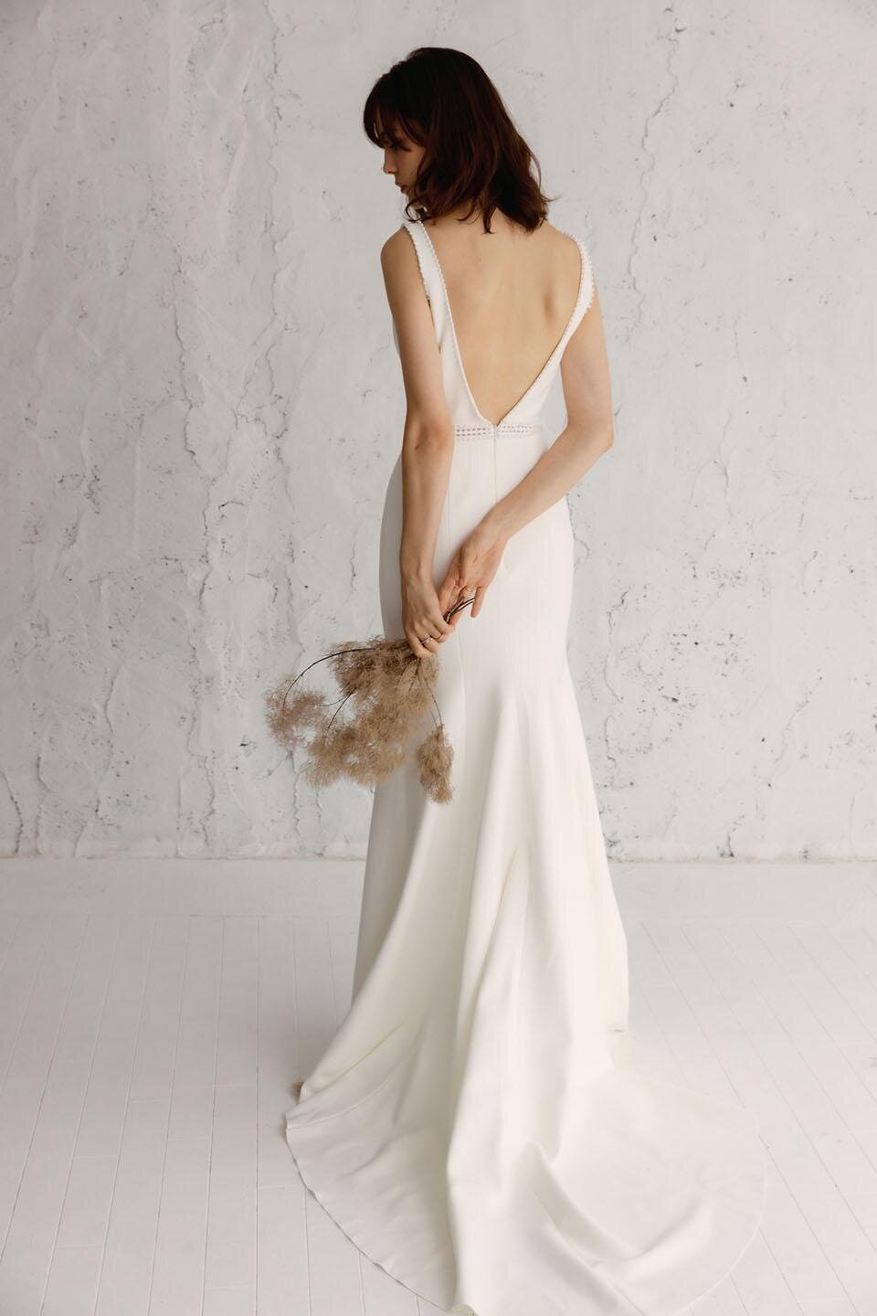 Modern luxury redefined, the Journey gown features a flattering V-neckline adorned with delicate pearl hand-beaded embellishments. A bold, embroidered waistband of cut-out details define the waistline and a fit-and-flare silhouette made of our bonded crepe georgette fabric perfectly embraces the feminine figure in all the right places.