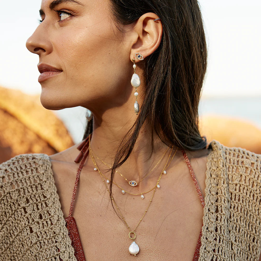 The Seychelles baroque pearl drop earrings have been handcrafted from solid brass and genuine freshwater baroque pearls. They are part of our Golden Hour collection. Sunsets, sunrises, salt air and beaches from all over the world have inspired this new collection. European beachside glamour in the 1960’s, sunny beaches and warm breezes with sun-dappled nonchalance. That beautiful feeling of summer, sun-kissed golden glowing skin, white sandy beaches and azure blue oceans. It is a feeling and a lifestyle I would want to experience every day! This collection captures magical coastal locations including Positano, Cannes, Mykonos and St Tropez.