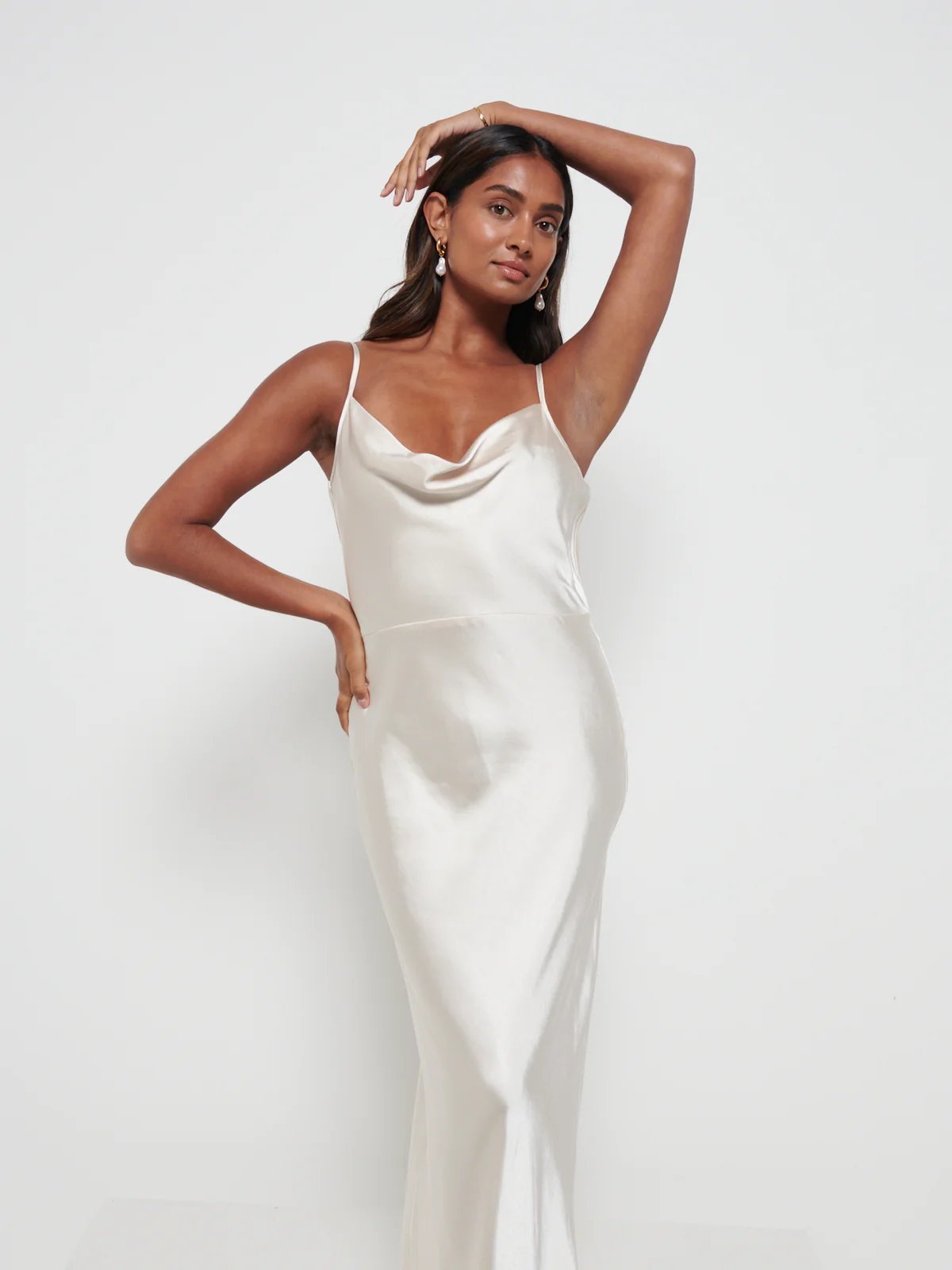Made out of a luxurious satin with a silk feel and lavish sheen. It has been intricately designed with a flattering cowl neckline and spaghetti straps to give a simplistic, feminine look. The maxi-length drapes beautifully to the floor, your bridesmaids will feel their best on your big day.
