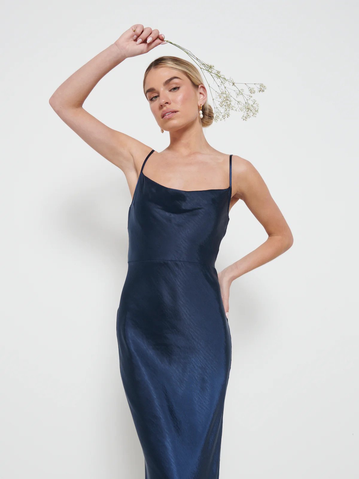 Made out of a luxurious satin with a silk feel and lavish sheen. It has been intricately designed with a flattering cowl neckline and spaghetti straps to give a simplistic, feminine look. The maxi-length drapes beautifully to the floor, your bridesmaids will feel their best on your big day.