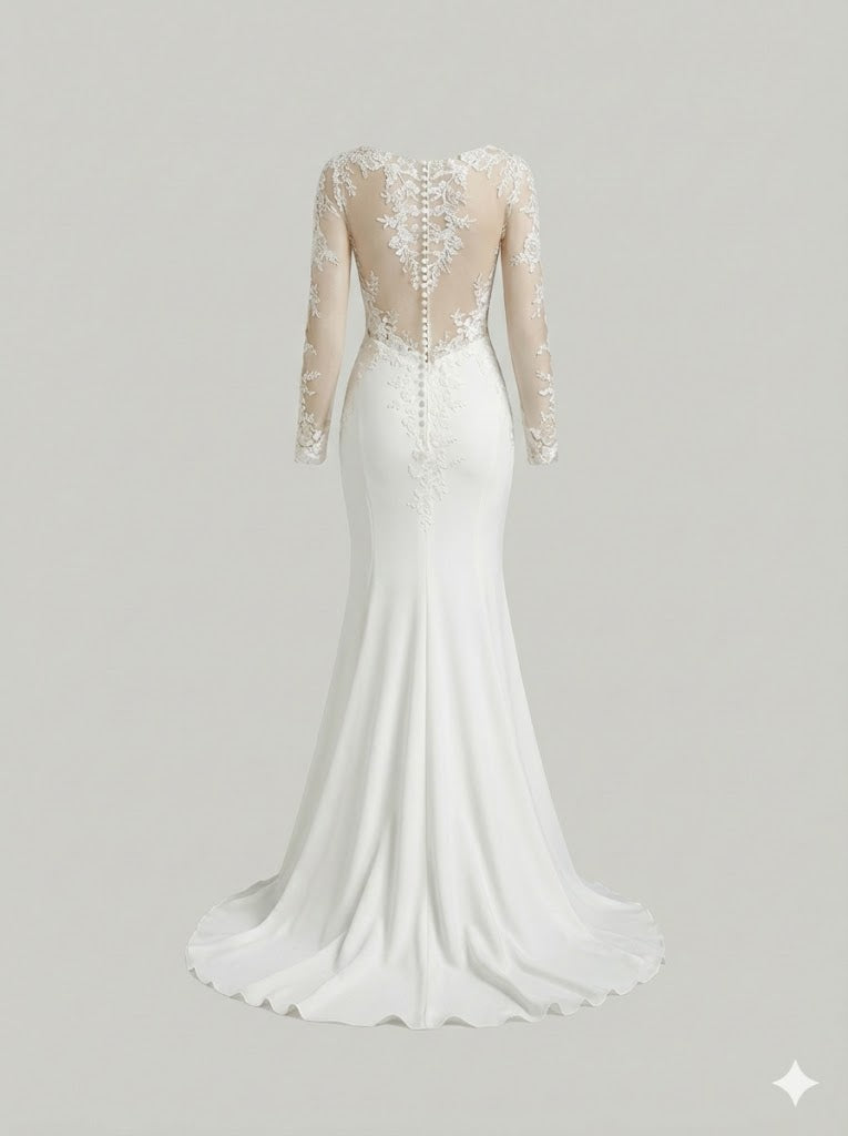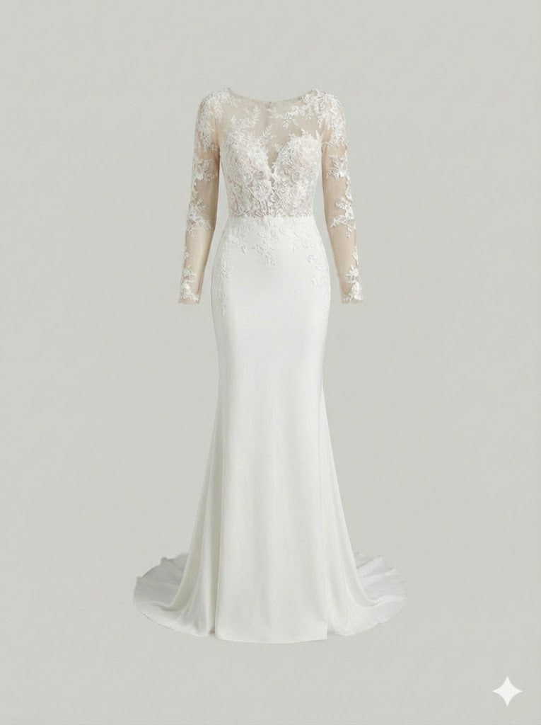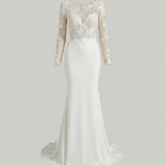 A sophisticated look in a classic crepe, this mermaid-cut dress is softened with luxurious lace inserts on the fitted back and lower arms, while the skirt and court train flow with silver-screen style.