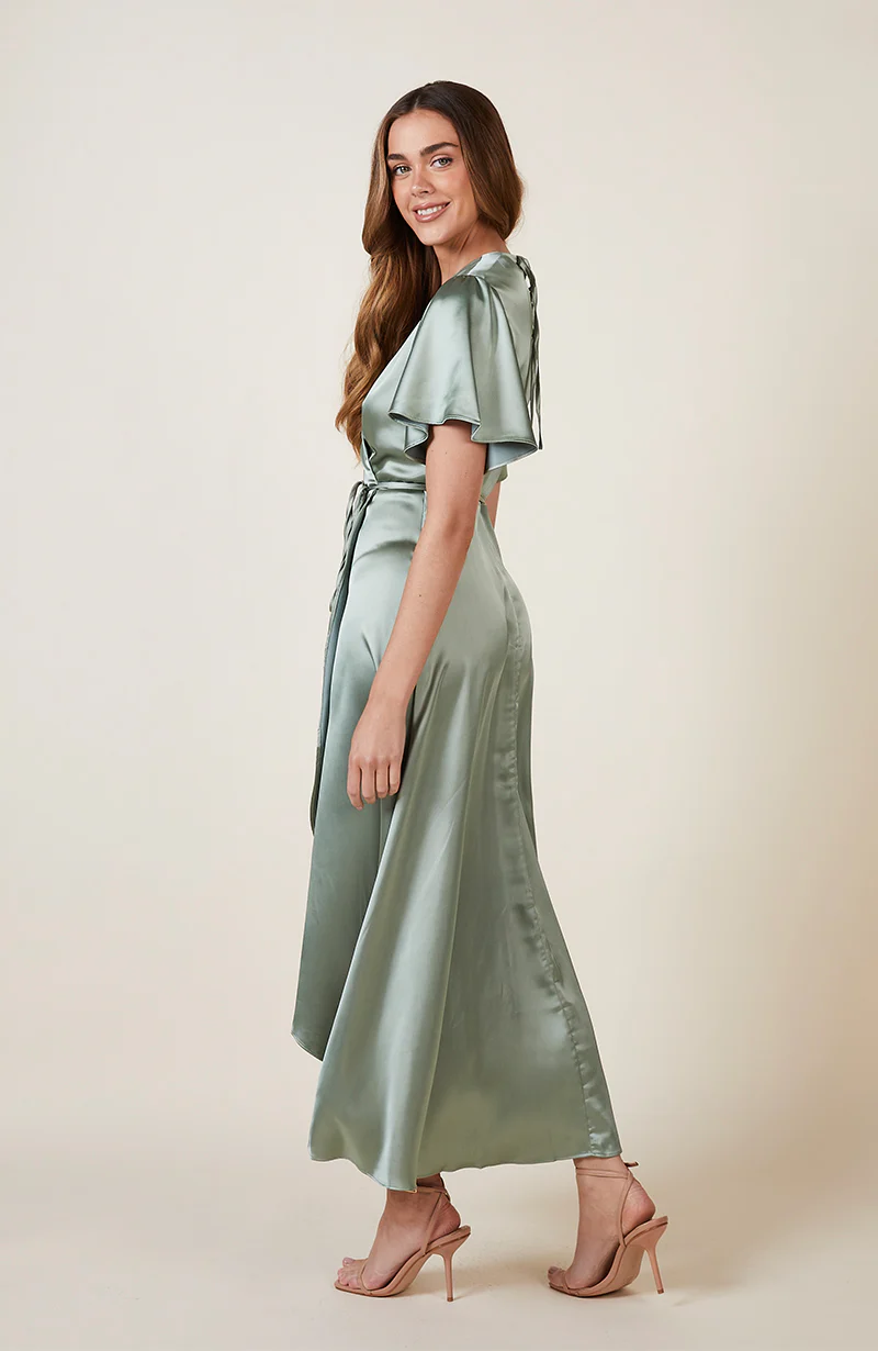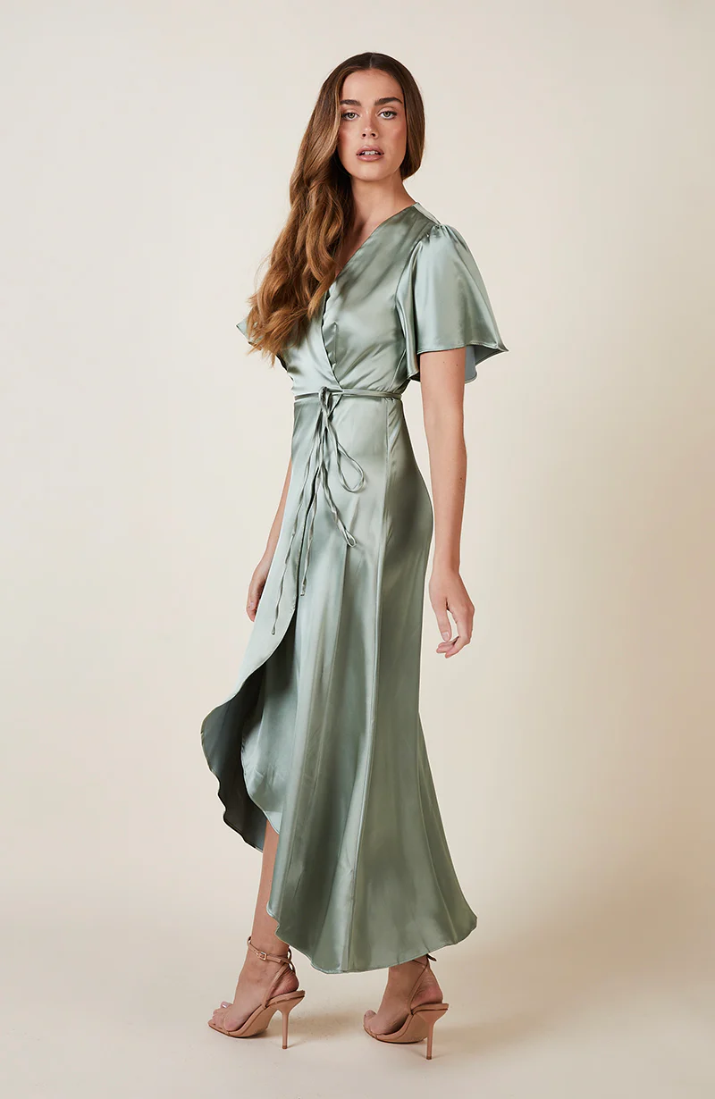 The Florence Waterfall hem bridesmaids wrap dress is crafted in the most beautiful satin.